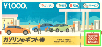 2026年4月現在発行されているガソリンのギフト券の有効期限は、2029年12月31日までです。